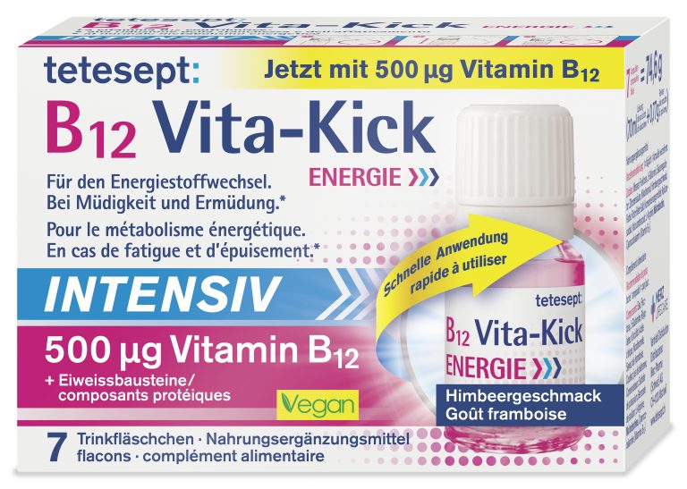 tetesept B12 Vita-Kick versorgt den Körper mit Eiweissbausteinen und hoch dosiertem Vitamin B12, für mehr Energie und Leistungsfähigkeit.