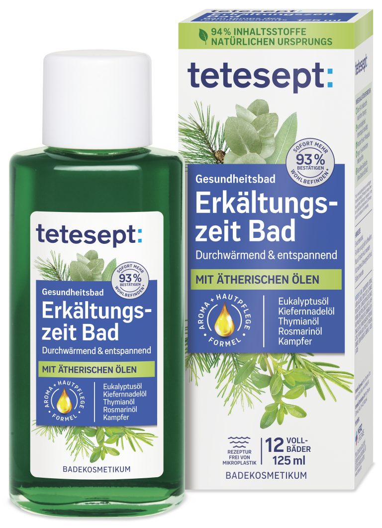 tetesept „Erkältungszeit“ Bad ist ein wohltuender kosmetischer Badezusatz mit natürlichem Duft-Effekt zur wohltuenden Entspannung im warmen Bad.