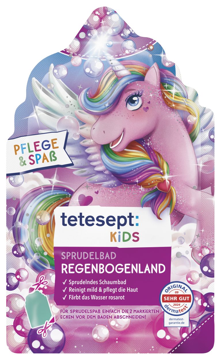 Badewanne mit ausreichend warmem Wasser füllen. Das Sachet vor dem Aufschneiden gut durchschüttlen, damit sich das Badesalz durchmischt. Dann Sachet waagerecht halten und mit der Schere die markierte Ecke unten rechts sowie die Spitze entlang der Schnittkante aufschneiden. Dabei am besten mit dem Finger die aufgeschnittene Ecke unten rechts verschliessen, damit das Salz nicht austritt. Dann das Sachet senkrecht bis ca. zur Hälfte ins Badewasser halten, dabei darauf achten, dass die beiden Schnittkanten nun richtig geöffnet sind. Jetzt tritt der farbige Sprudelschaum aus dem Horn des Einhorns. Für einen schönen Effekt das Sachet durch das Wasser bewegen, sodass der Schaum rosarote Schlieren ziehen kann. Je nach Belieben 10 bis 20 Minuten lang bei 35 bis 38 °C baden. Spülen Sie die Badewanne nach dem Baden mit heissem Wasser aus, um Produktrückstände zu entfernen.