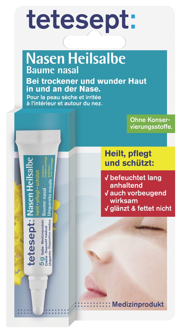 Medizinprodukt zur Anwendung an der empfindlichen Haut in und an der Nase. Soweit nicht anders verordnet, wird tetesept Nasenheilsalbe ein- bis mehrmals täglich als Salbenstrang (ca. 1 cm) auf die betroffenen Schleimhäute und um die Nasenöffnungen herum aufgetragen.